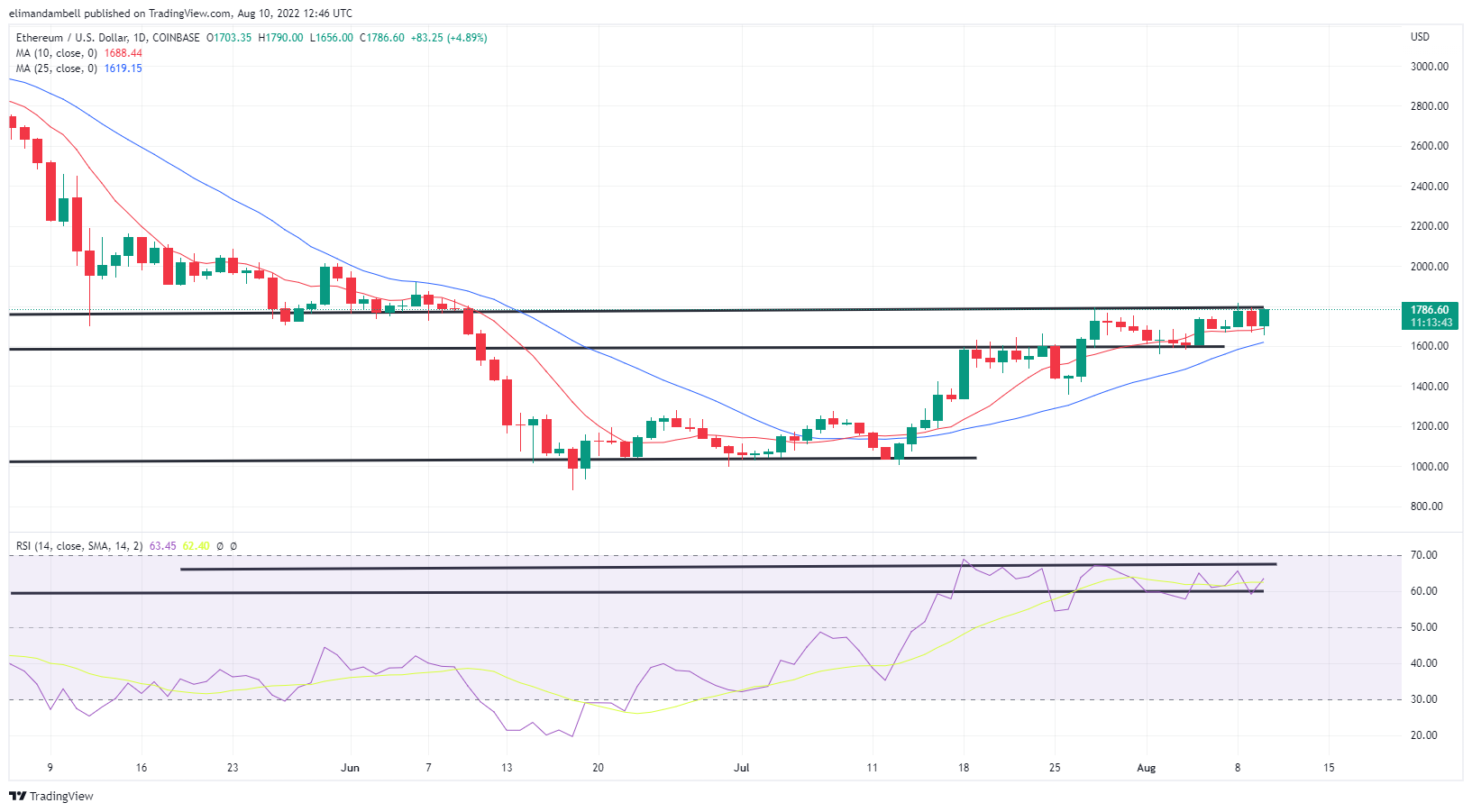 Similar to bitcoin, price strength in ethereum has gained, following a false breakout of the support level of 60, in the 14-day relative strength index indicator.